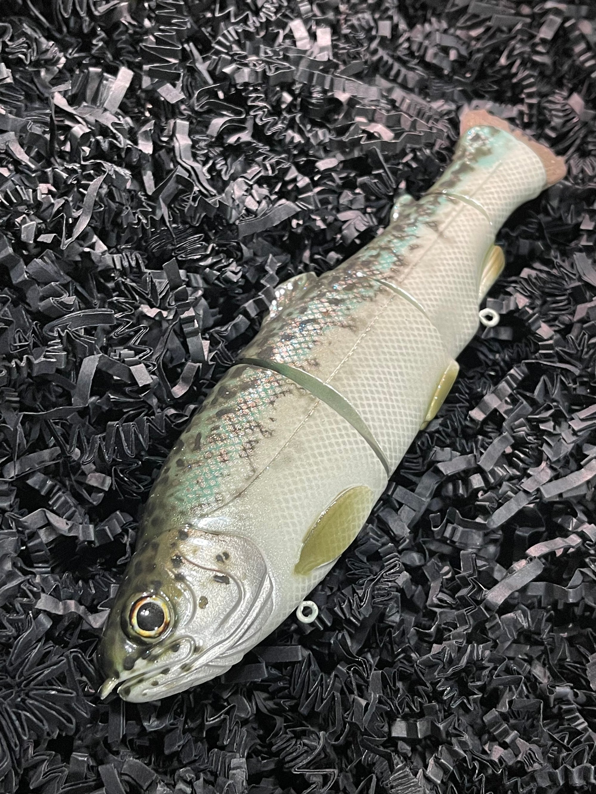 Includes Gamakatsu size 4 round bend trebles, owner hyperwire split rings, swiveling hook hangers, premium 3D eyes & a premium hand poured rubber tail.